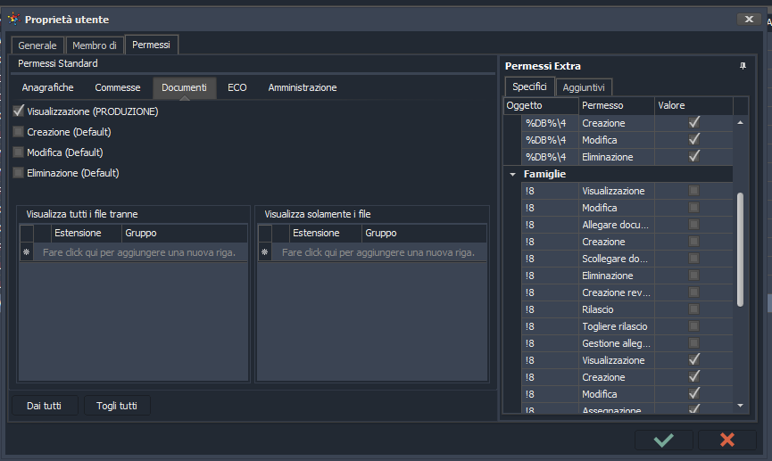 Oltre che su famiglie intere, è possibile dare anche permessi speciali su determinati tipi di utenti/gruppi.